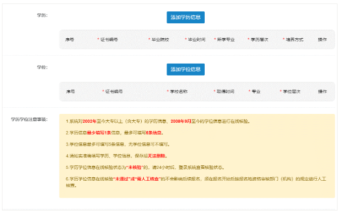 如果报考人员有多个学历,请添加所有学历信息。包括全日制和非全日制学历。建议大家在填写报考信息时仔细检查证书编号、毕业时间、所学专业及院校名称,避免因信息有误,导致核验无法通过。如果证书不在身边,不知道证书编号的话,可以登录【学信网】查询,流程如下: