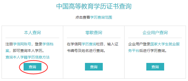 (2)在“本人查询”下,点击“查询”按钮,登录个人学信网账号(若无账号可根据提示注册);